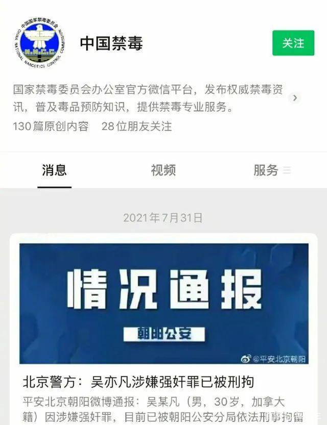 在警方通报吴亦凡被刑拘后没多久,中国禁毒官方在多平台也发布这一消息。