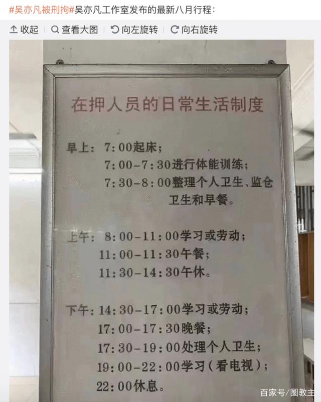 如果吴亦凡被判处有期徒刑后,他将在中国服刑,服刑完之后将会被驱逐出境。热心网友赶紧搜索在押人员的日常生活制度,发文称吴亦凡八月行程表出来了。