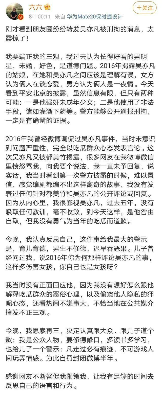 消息被通报后,娱乐圈的艺人、编剧们也开始有动作。编剧六六发文为2016年曾力挺吴亦凡道歉,称当时未意识到问题严重性,完全以吃瓜群众心态发表言论。