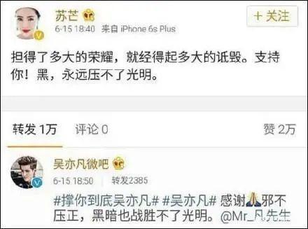 苏芒至今也保留着当年力挺吴亦凡的微博。 随后马薇薇、六六微博被封,苏芒被禁言。