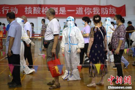 8月2日,南京市宁海路街道核酸检测点内,市民排队准备接受核酸检测取样。