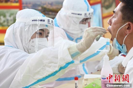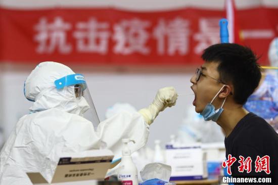 8月2日,南京市宁海路街道核酸检测点内,志愿者引导市民接受核酸检测取样。(中新社记者 泱波 摄)