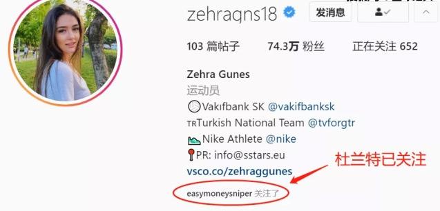 ZehraGunes是一位99年出生的小姑娘,身高达到1.97米,从她在instagram上发布的照片来看,身材非常好,并且拥有天使般的面容,在赛场上的表现也十分出色,这也难怪把杜兰特给迷住了。
