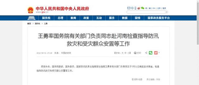 8月1日,据新华社消息,受党中央、国务院委派,国务委员、国家防汛抗旱总指挥部总指挥王勇率有关部门负责同志于7月31日晚赶赴河南省,检查指导防汛救灾和受灾群众安置等工作。