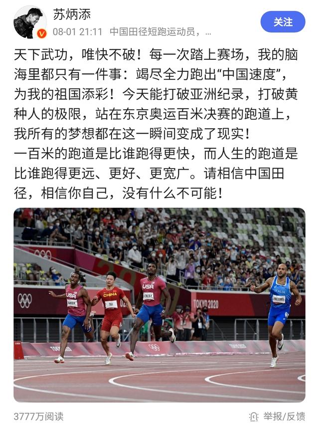 苏炳添赛后也发表了自己的理念,相信自己能行,拼尽全力,跑出自已的风采,为祖国的田径添彩。
