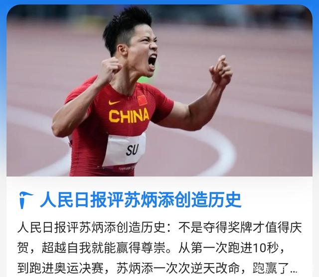苏炳添在东京奥运会历史性的突破,也将载入史册。人民日报发文表扬他,认为奥运会的精神便是勇往直前,超越自我。金牌很重要,但是对于这种奥运会精神一样令人钦佩。