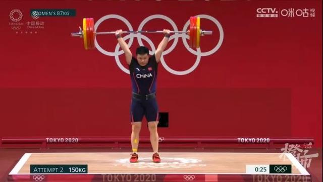 汪周雨在决赛中拿下挺举150公斤的关键一举