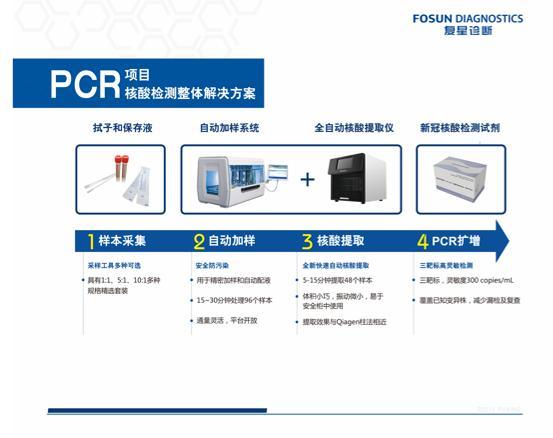 复星医药旗下复星诊断所提供新冠核酸检测的整套试剂、设备及耗材整体解决方案,已经过全面的性能验证及临床试验,在快速安全、通量灵活、灵敏度高及结果可靠等方面具有更强的优势,现已支持国内和国外多个国家用于疫情防控,在产品质量及售后服务上深受认可。