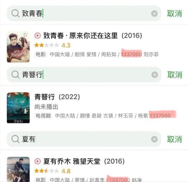 有网友想知道吴亦凡的那几部作品是否被下架,就去某瓣检索了一下,发现作品还在,但演员表中的“吴亦凡”名字不见了,被替换成一串数字“1337000”,因此被网友调侃“查吴此人”。