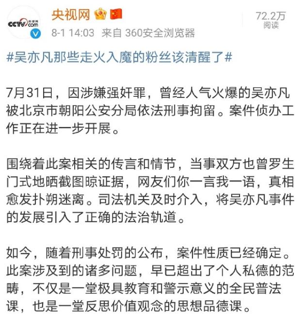 针对吴亦凡那些疯魔的粉丝,央视网在8月1日就发文警示:“吴亦凡那些走火入魔的粉丝该清醒了!”