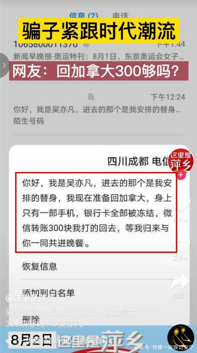 吴亦凡被拘留后,电信诈骗也玩出了新花样,大概是想碰运气,能碰到一些不太聪明的粉丝,骗他们说:“进去那个是我安排的替身,我现在准备回加拿大,身上只有一部手机,银行卡全部被冻结。”