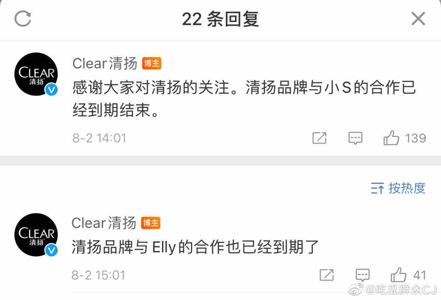 随后,小S代言的某饮用品牌官方发出声明,表示即日起终止和徐熙娣女士的一切品牌合作。小S曾代言过的某洗发水也发声明澄清,表示合作已经到期结束。