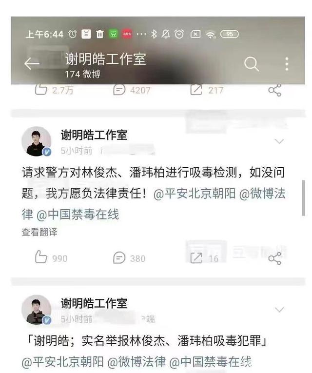 针对网上的谣传,林俊杰方8月1日发布律师函以侵害名誉权的理由警告多名网络用户,表示他们所说的都是不实言论,也进行了辟谣那些不实的传闻。然而事件并未完结,8月2日凌晨,男星谢明皓通过工作室发文,称要实名举报林俊杰和潘玮柏是吴亦凡共犯,三人都有吸毒等犯罪行为,还要求警方立案侦查。谢明皓还表示如果检查完没有问题,他愿意承担相关的法律责任。