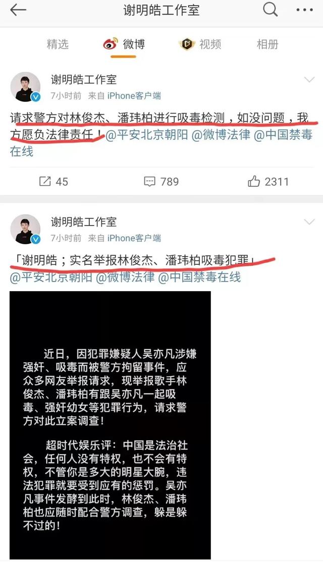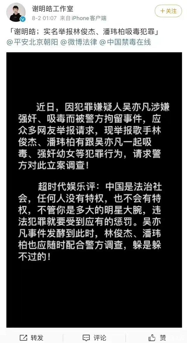 娱乐圈的大瓜一个接一个,继吴亦凡被行拘之后,90万粉丝大V谢明皓工作室在8月2日凌晨实名举报林俊杰、潘玮柏与吴亦凡一起XD,QJ幼女。