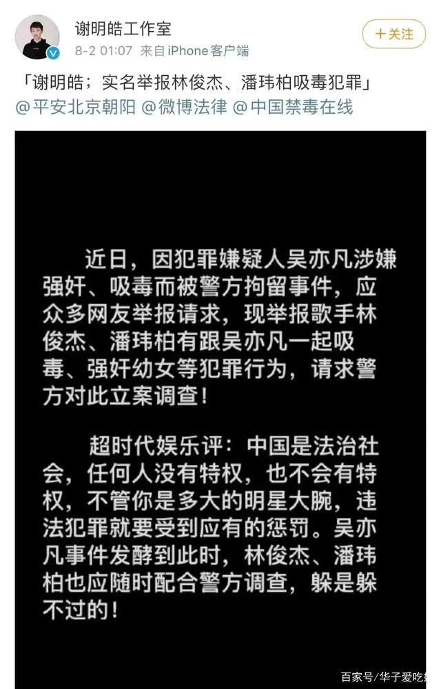 这不就在8.2日11:54分的时候,谢明皓再度发文称:关于实名举报林俊杰、潘玮吸D犯罪,写给中国媒体同仁的一封“敢言信”!