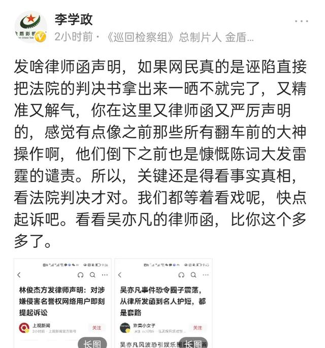 如果网民冤枉了你,你完全可以直接去法院起诉。不要发一堆律师声明,真的没用!之前“翻车”的那些大神们,都是在倒下前慷慨陈词,大发雷霆!看看吴亦凡的律师函,比你这个多多了。