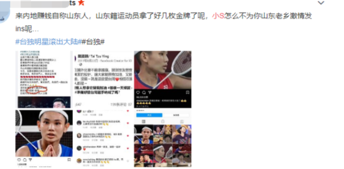 而小S支持的羽毛球运动员戴资颖,在ins也被扒出有过不当言论,比如说什么,经常在国外比赛不能拿国旗,还有经常拿中国和台湾作比较,并把台湾以外的地方称为“国外”等。