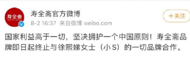 随后,寿全斋官博发文“国家利益高于一切,坚决拥护一个中国原则!寿全斋品牌即日起终止于徐熙娣(小S)女士的一切品牌合作。”