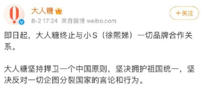 就连6月刚刚宣布小S为品牌代言人的大人糖,也在今天发布了与小S结束品牌合作关系:即日起,大人糖终止与小S(徐熙娣)一切品牌合作关系。大人糖坚持捍卫一个中国原则,坚决拥护祖国统一,坚决反对一切企图分裂国家的言论和行为。