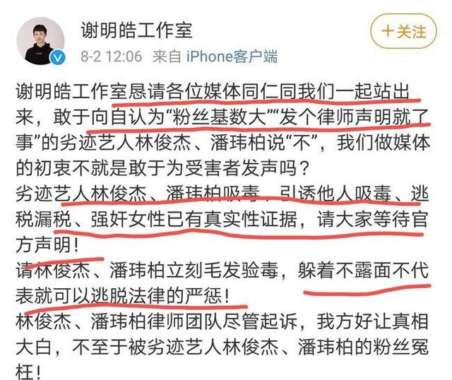 近日在吴某被朝阳警方刑拘之后,谢明皓工作室发声明称要实名举报林俊杰和潘玮柏,表示他们也和吴某一样看似表面干净,其实背地里也都是肮脏不堪,并且还表示自己如果造谣愿意付出相应的法律责任。不过面对这样的声明,网友们还是能保持应有的理性,认为之前谢明皓就曾多次蹭热度不值得相信,但也希望可以调查清楚给大众的交代。