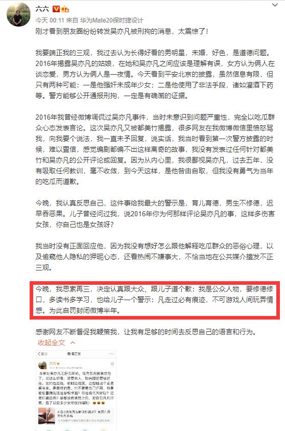 有人反对,就会有人支持。在吴亦凡落败的时候,六六就站出来表示,自己在五年前,是被吴亦凡给蒙蔽了。