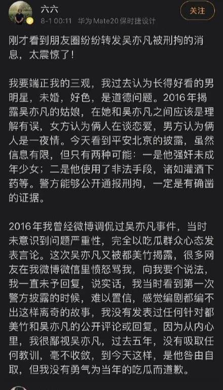 网络是有记忆的,说过的话,做过的事,就算时间能淡化,但是总有人会替你记得。在吴亦凡被拘禁后,四年前曾经因为小G娜一事而公开力挺过他的人相继站出来道歉。比如知名编剧六六,脱口秀演员马薇薇,以及时尚集团前总裁、《时尚芭莎》总编辑苏芒。