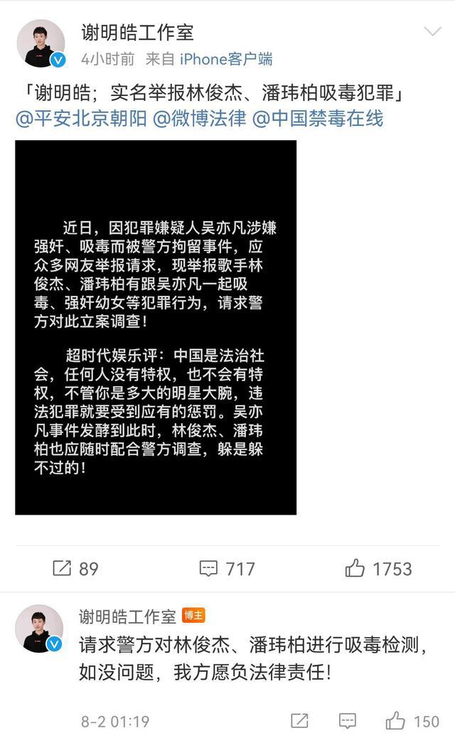 没想到,在这个节骨眼上,微博名为“谢明皓工作室”的用户跟进此事,声称:“谢明皓实名举报林俊杰、潘玮柏吸毒犯罪”,并且@了平安北京朝阳,以及中国禁毒在线。谢明皓表示,“如没问题,我方将负法律责任。”