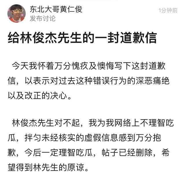 在林俊杰发出律师函后,律师声明中提到的诸多博主纷纷删除爆料内容, 并发文道歉,请求林俊杰原谅他们,发布了未经核实的内容。(道歉信很多,暂且只贴一张)