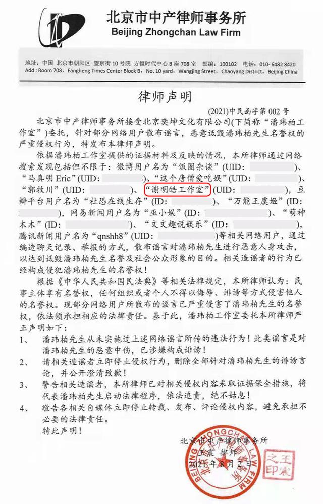 面对谢明皓的举报,潘玮柏方面也发出了律师函,否认了网上提到的违法行为,并且在诉讼的博主名单中,就有“谢明皓工作室”,要求对方立即停止转载。发布、评论侵权内容。