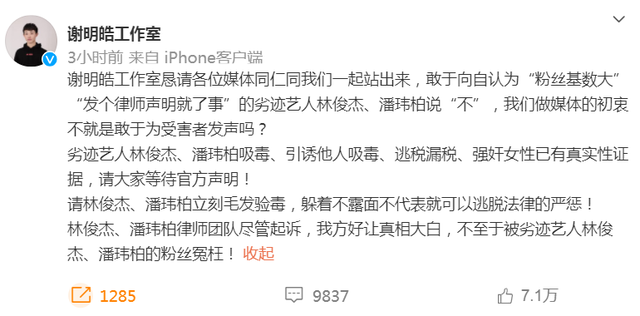 但是,谢明皓并未停止他的言论。他号召网友们一起站出来,敢于向自认为“粉丝基数大”“发个律师声明就了事”的劣迹艺人林俊杰、潘玮柏说“不”。