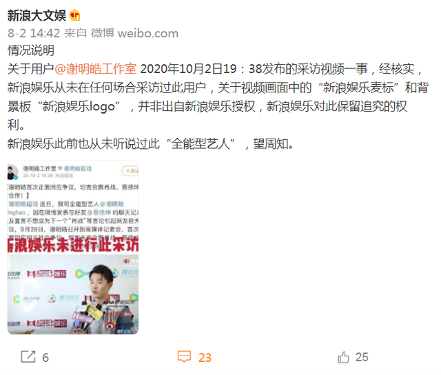 在谢明皓举报林俊杰、潘玮柏后,针对谢明皓微博置顶的视频内容,新浪大文娱官方发文澄清,新浪娱乐从未在任何场合采访过谢明皓,新浪娱乐也从未听说过此“全能型艺人”,望周知。(这句澄清,伤害性不大,侮辱性极强)