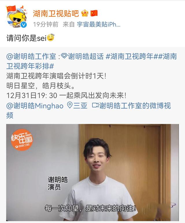 随后,湖南卫视贴吧转发了谢明皓的一则视频,发文澄清,“请问你是sei”。该视频是湖南卫视跨年演唱会的,谢明皓在视频中,假装是受到邀请的明星,在录制贺词。