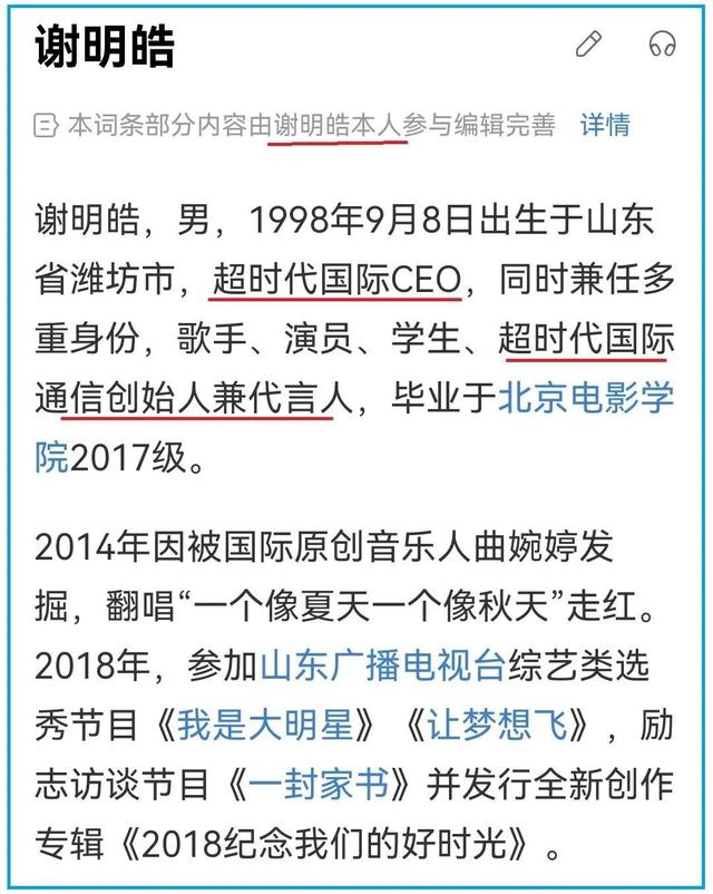 打开谢明皓的百科,真有点被吓到,他太牛了,是“某国际公司”CEO,全能艺人,还是“某国际公司”的代言人。这么大个CEO,还亲自参与编辑百科词条,也是够亲民的,自己代言自己的公司,在娱乐圈算是独树一帜。