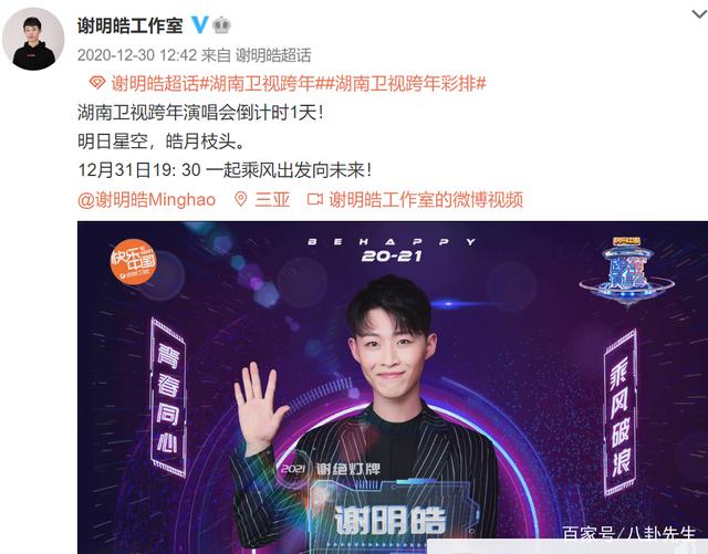比如这条微博,跟很多明星发布的活动预告一模一样,logo、地点、时间、话题一样不缺,不知道的还以为谢明皓真的受邀参与湖南卫视跨年夜演出呢。