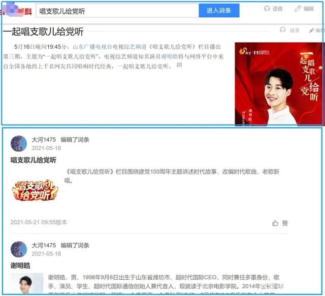 更滑稽的是,这节目还专门搞了个百科词条,词条里单独介绍了谢明皓,还放了他灿烂如花的海报,这很诡异、反常,点开词条编辑者的主页一看,编辑记录都是谢明皓相关的。