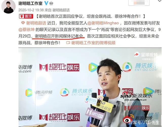 再来看“全能艺人”谢明皓去年蹭足了蔡徐坤和肖战的热度后,召开了记者会,看logo,只有两个头部娱乐媒体获得了采访资格,另一个是他自己担任CEO的超时代。