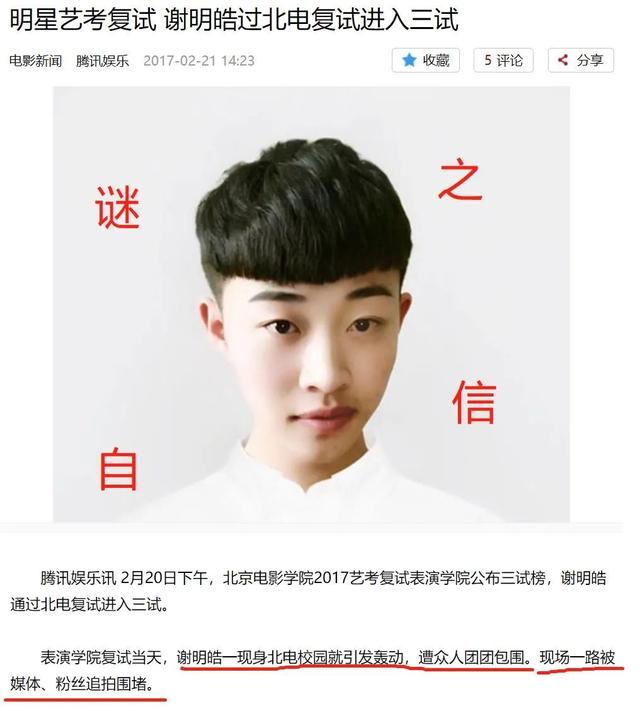 谢明皓的百科还说他是北电2017级毕业,他还自诩是王俊凯的同学,是TFBOYS的好兄弟,但北电的录取名单根本就没有他,他当时还找媒体发了通稿,说“一现身北电校园就引发轰动,遭众人团团包围,媒体、粉丝追拍围堵”,但一张在现场的图都没有。
