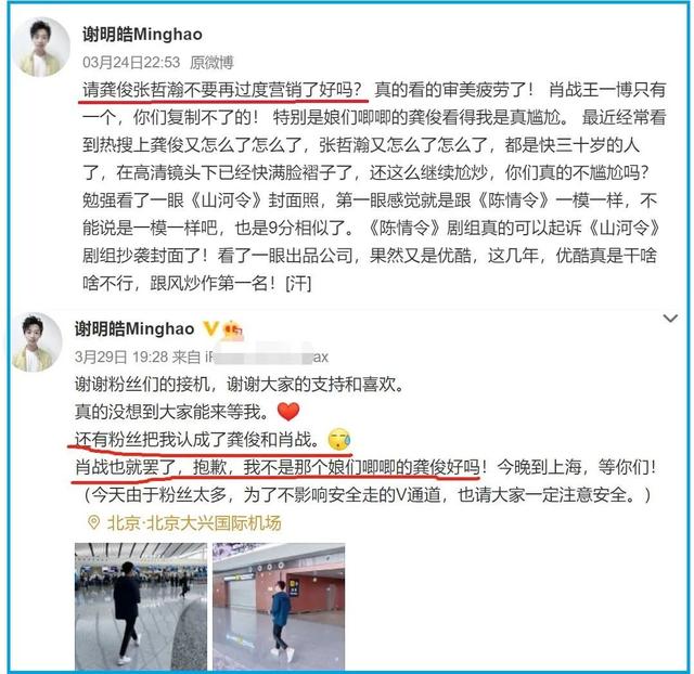 最近蹭肖战、龚俊和张哲瀚最卖力,大言不惭说有粉丝把他认成了龚俊和肖战,大骂龚俊和张哲瀚过度营销。