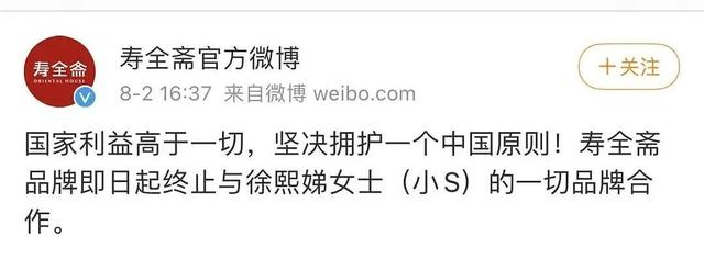 紧接着国货寿全斋宣布即日起终止与小S的一切平拍合作,并表示国家利益高于一切,坚决拥护一个中国原则。寿全斋这个行为也受到了网友们的好评,称赞寿全斋的速度可以。