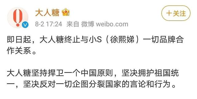 大人糖也宣布终止和小S一切品牌合作关系,并表示坚持捍卫一个中国原则。此行为也获得网友们的好评,在面对国家尊严和利益时,大家都是一致团结的。
