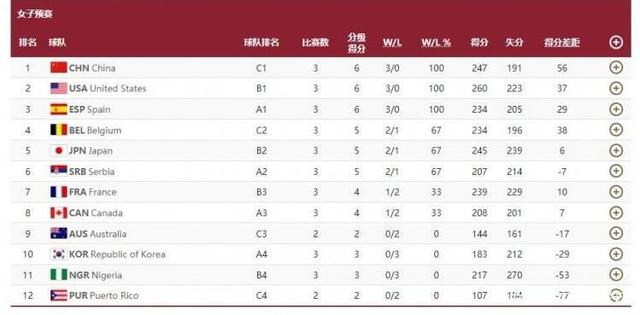 值得一提的是,中国女篮是这12支参赛队中战绩最好的队伍,她们与美国队、西班牙队的战绩同为三战全胜(中国女篮小组赛首战以97-55大胜波多黎各队,第二场76-74罚球绝杀劲旅澳大利亚队),但中国队的净胜分高达56分,比第二的美国队多19分,她们完全有机会去争夺奖牌。