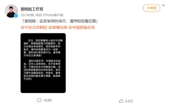 近日,艺人谢明皓实名举报林俊杰、潘玮柏吸毒犯罪,并称希望警方对林俊杰、潘玮柏进行尿检,如果没有问题,谢明皓愿承担一切法律责任。