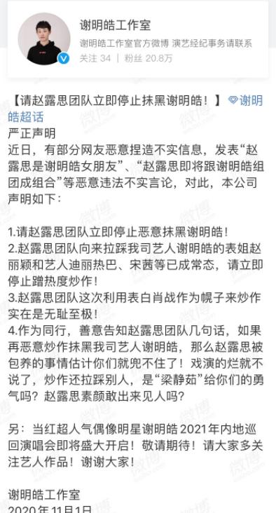 但是小编感觉这次倒没这么简单,这个谢明皓虽然平时嘴大,但都说的是娱乐新闻,蹭热度。这次若不是掌握一定的证据,一般不敢实名举报,因为造谣者是要负相关法律责任的。就是看他手里的证据到底是石锤,还是仅仅是道听途说的小道消息。事情的发展还是要看后续是否有证据放出,以及警方的调查结果来做最终判定。