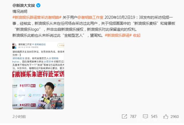 他的工作室发博称新浪对他进行独家专访,而新浪娱乐也第一时间出来澄清并未对什么“全能型艺人”谢明皓进行过采访,所谓现场图片都是P的。