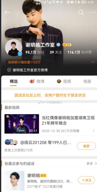 谢明皓工作室的账号也被微博封禁,理由是违反社区公约,直接禁言!