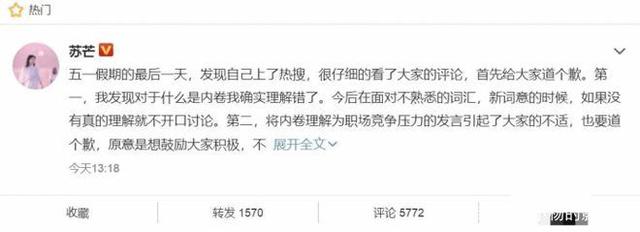 之前,苏芒又错误理解“内卷”的意思,她觉得“内卷”是一种竞争压力,来自于欲望和惰性的差距,但不少网友认为她的理解有误。之,她在社交平台表示道歉,网友群嘲:太假,不领情!