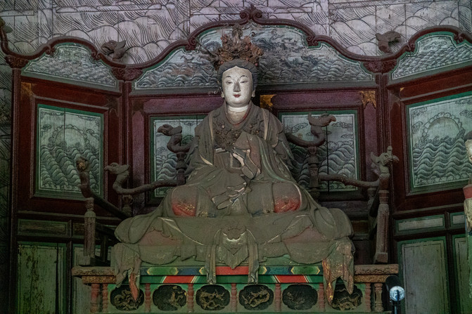 依次有楼道、山门、钟鼓楼、献殿、大雄宝殿及二层三面围楼24间。各院两侧各有配殿,供枷蓝、关羽、达摩及观音、地藏菩萨。在横轴线上,左有方丈院,右有客堂院。西侧另辟观音堂,自成格局。大雄宝殿的释迦牟尼佛,双目微睁,面相慈祥,踟趺坐在莲花上,显得格外庄严肃穆。