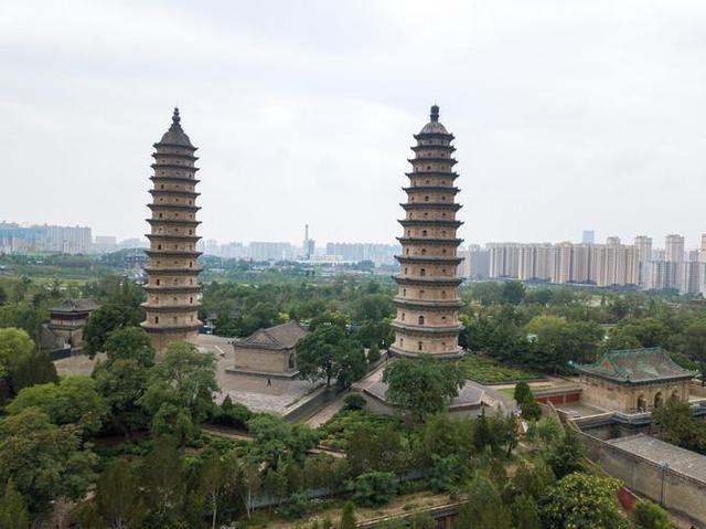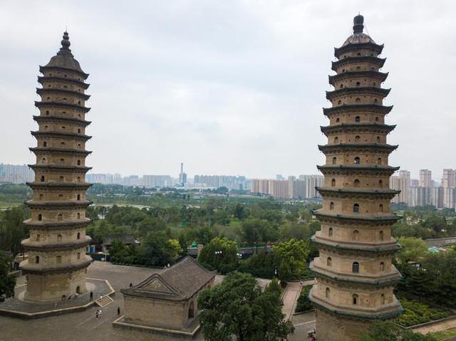 远远望去,景区内部两座砖塔:居东南的文峰塔和居西北的宣文佛塔。双塔是太原现存古建筑中最高的建筑,建造于明代时期也是全国砖仿木结构最高的双塔,非常出名。