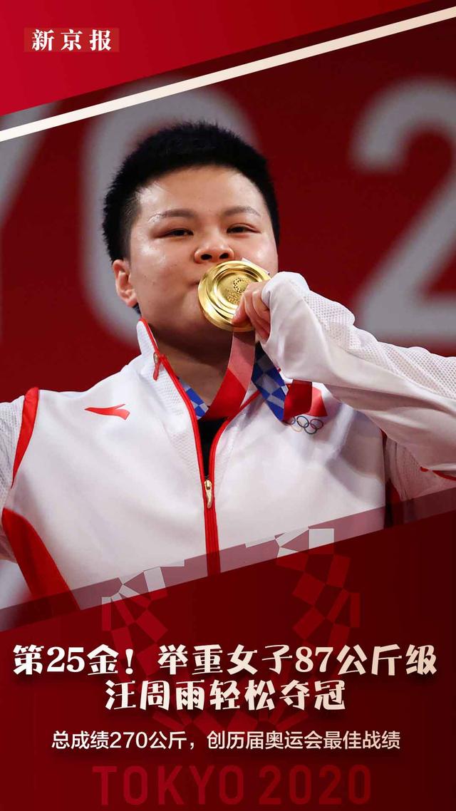 东京奥运会中国举重队收官日再迎金牌,在女子87公斤级比赛中,汪周雨以总成绩270公斤夺冠,这也是中国举重队在东京的第6枚金牌,创历届奥运会最佳战绩。第25金!举重女子87公斤级汪周雨轻松夺冠