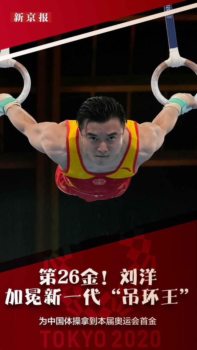 在东京奥运会体操男子吊环决赛,中国选手刘洋得到15.5分,加冕新一代“吊环王”,为中国体操拿到本届奥运会首金,也是中国代表团第26枚金牌。尤浩以15.3分获得银牌。162789300014299